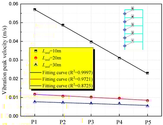 Figure 17 illustrates the vibration velocity-time curve of the building at gauge 1 under varying soil depth conditions. The graph indicates that at a soil depth of 10 m, the building’s vibration velocity peaks at 0.057 m/s. As the distance from the explosion source increased, the peak velocity at gauge 1 gradually diminished, and the peak arrival time was delayed. At a soil depth of 20 m, the peak vibration velocity decreased rapidly, with a 79% reduction compared to the 10 m soil depth. At a soil depth of 30 m, the vibration velocity attenuation slowed to 0.0076 m/s. The rate of attenuation in building vibration velocity was primarily influenced by the peak overpressure of the explosion shock wave. When the tunnel burial depth exceeded 20 m, the peak overpressure of the explosion wave decreased, leading to propagation primarily in the form of elastic waves within the building’s main structure. This resulted in a relatively stable wave profile and a slower attenuation rate. Figure 18 compares the maximum vibration peak velocity and its fitting curve at each gauge under different soil depth conditions to explore the vibration response characteristics of various positions on the building structure’s surface. The comparison illustrated in Figure 18 reveals that under the same soil depth, the building structure’s vibration acceleration decreased linearly with increasing distance from the explosion source, approaching zero as the distance tended to infinity.