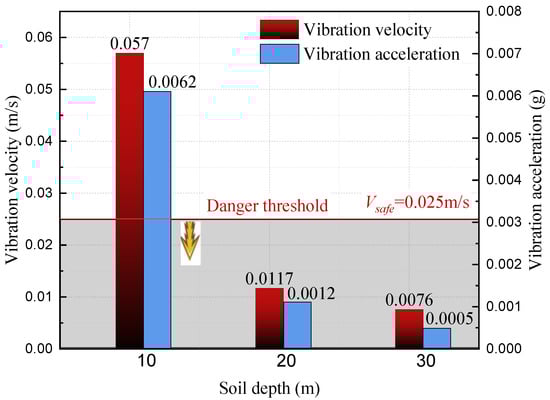 Figure 19 provides a quantitative analysis of the explosion vibration risk for building structures under varying soil depths. It is evident that at a soil depth of 10 m, the building’s vibration acceleration remained below the safety threshold. However, the maximum vibration velocity reached 0.057 m/s, significantly exceeding the velocity safety threshold (Vsafe = 0.025 m/s). In our simulation of the event of a natural gas explosion in the tunnel, ground buildings faced the risk of vibration damage due to the explosion shock wave. At soil depths of 20 m and 30 m, the maximum vibration velocities resulting from the leakage and explosion of the natural gas pipeline were 0.0117 m/s and 0.0076 m/s, respectively, both below the safety threshold. Consequently, the actual risk of ground building vibration acceleration due to tunnel explosions under these soil depth conditions falls within an acceptable range.