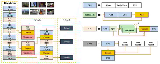 YOLOv8n uses a modified version of the CSPDarknet [] architecture as its backbone. It comprises stacked modules, including CBS (light blue colored blocks in Figure 1) (convolutional layer (Conv) + batch normalization (BatchNorm []) + Sigmoid Linear Unit (SiLU [])) and C2f modules (warm peachy colored blocks in Figure 1), culminating in the spatial pyramid pooling fast (SPPF) module (gray colored blocks in Figure 1). While CBS and C2f modules aid in feature extraction, the SPPF module enhances feature expression using max pooling on previously pooled features, improving module efficiency.