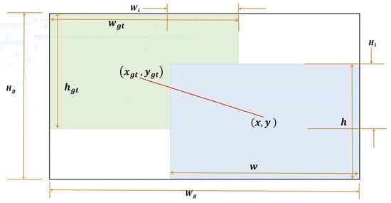where is the intersection over union []; is the gradient gain, and are the anomaly levels of the predicted box, with lower values indicating higher quality. Smaller gradient gains are assigned to boxes with larger anomalies to reduce the harmful gradients during training. and are the hyperparameters controlling gradient gain. Figure 4 presents the other parameters, with blue and green boxes representing predicted and ground truth boxes, respectively. Coordinates are denoted by and , while the heights and widths are and . and are the height and width of the intersection rectangle, while and are the height and width differences between the combined boxes and their intersection. in Equation (1) is the union area of the predicted box and the ground truth box.