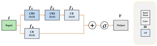 where represents the input to the block, the block (light blue colored blocks in Figure 5) denotes a sequence of a convolutional layer, batch normalization layer, and SiLU activation function, while the block (powder blue colored blocks in Figure 5) consists of a convolutional layer followed by a batch normalization layer, and represents the SiLU activation function.