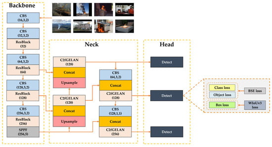 In the neck network, this study introduced C2fGELAN—the integration of C2f and GELAN blocks (warm peachy colored blocks in the neck in Figure 6)—enriching extracted features with deeper semantic information (Figure 7). This comprehensive understanding of image content empowers the model to distinguish smoke and fire from other visual elements more precisely, minimizing false alarms and enhancing overall detection accuracy. The WIoUv3 loss function (light steel blue colored block in the neck in Figure 6) was used as the box predictor loss function, replacing the standard CIoU. This strategic choice significantly enhanced the accuracy of the model in detecting smoke and fire at the earliest stages. The WIoUv3 loss function provided a more refined and precise approach, allowing the model to identify potential fire hazards more accurately.