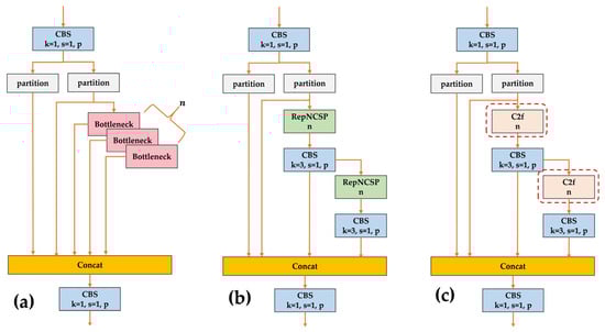 C2fGELAN architecture. (a) C2f, (b) RepNCSPELAN4 (Reparametrized Cross-Stage Partial and ELAN)—an advanced version of CSP-ELAN used in YOLOv9—and (c) C2fGELAN.