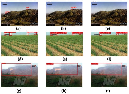 Comparison of the detection results of the original and ESFD-YOLOv8n models for small-scaled images. (a,d,g) Labeled images, (b,e,h) images predicted by ESFD-YOLOv8n, and (c,f,i) images predicted by the original YOLOv8n.