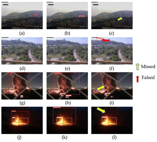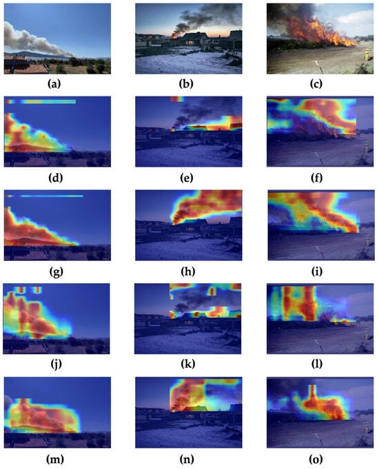 Figure 10 provides a clear visualization of the improvements by comparing the proposed model and the original YOLOv8n model on the same images. The bright red and yellow areas on the feature map indicate regions where both models detected significant features, while the blue areas show regions of lower attention. The input images (Figure 10a–c) are presented with enhanced smoke and fire visibility for clarity. The differences between the C2f and ResBlock modules are shown in Figure 10d–f and Figure 10g–i, respectively. Figure 10g–i show the superior ability of the ResBlock module to capture finer details, guiding the backbone network toward more pertinent information. The original and modified necks of YOLOv8n and ESFD-YOLOv8n are depicted in Figure 10j–l and Figure 10m–o, respectively. The enhanced feature maps in Figure 10m–o show the effectiveness of the C2fGELAN upgrade, resulting in heightened resolution and facilitating efficient context aggregation and fusion within the network.