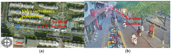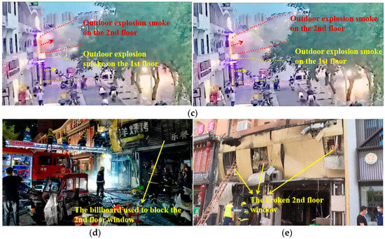 At 20:40 on 21 June 2023, an extremely serious LPG leakage explosion occurred at the ‘Fuyang’ barbecue restaurant in Minzu South Street, Xingqing District, Yinchuan City, Ningxia Hui Autonomous Region, China. Figure 2a,b shows the specific accident location. The accident resulted in a total of 38 casualties, including 31 fatalities and 7 injuries (1 critically ill, 2 with moderate burns, 2 with mild injuries, and 2 with glass scratches), with a direct economic loss of 51.145 million yuan. This disaster has garnered significant attention from people across the country due to the extremely serious casualties. The accident occurred in a two-story building. At the time of the accident, a surveillance camera outside captured the entire explosion process. The explosion shock wave, accompanied by a large amount of dust and smoke, was released into the external space at a high speed, as shown in Figure 2c. The power system of all the merchants on the entire street failed instantly, and windows up to 30 m away were shattered by high-speed fragments.