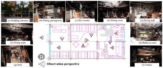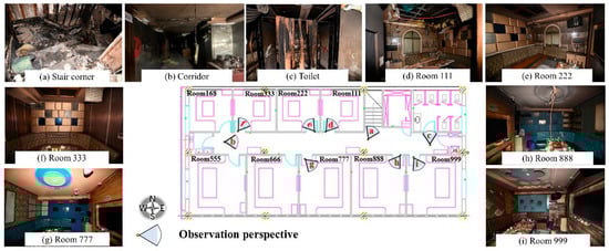 The second floor exhibited significant fire and smoke damage across most areas. Near the stair corner, the ceramic tiles on the wall surface showed signs of detachment, with the decorative surface charred by fire (Figure 4a). The corridor roof had collapsed, and the floor of the storage room situated at the mezzanine level of the stairs showed localized burn damage. Room 111 on the west side of the stairs displayed cracks in the composite wall core plate, along with fire traces. The top of the door in Room 111 exhibited clear wood decoration carbonization (Figure 4d). The door of Room 999 opposite the stairs was destroyed (Figure 4i), and some decorative ceramic tiles inside Room 888 had fallen off (Figure 4h). The corridor (Figure 4b) and the majority of rooms (Figure 4e–g) remained relatively intact.