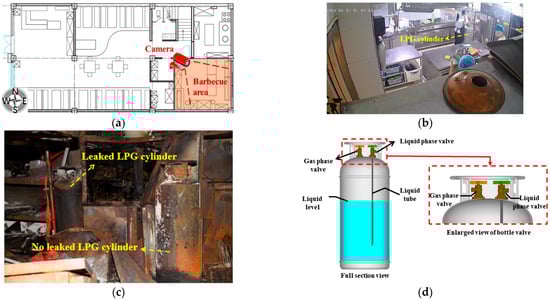 The double-valve LPG cylinders involved in the accident scene: (a) the area where the LPG cylinders were locatedcopyright; (b) LPG cylinder in the barbecue area before the explosion; (c) LPG cylinder in the accident scene; (d) schematic diagram of the double-valve LPG cylinder.