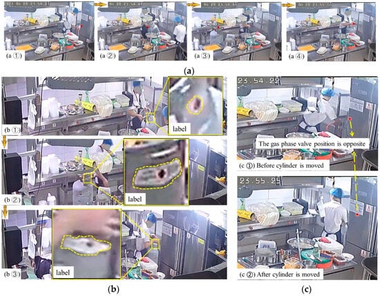The red dots highlighted in Figure 6a indicate the position of the gas phase valve on the gas cylinder, enabling the tracking of the gas phase valve’s position change process before and after the cylinder was moved. By observing the size of the label on the cylinder, it can be inferred that the valve’s position indeed changed before and after the cylinder’s movement. In Figure 6(b①), the label on the cylinder appeared small before it was moved. After the cylinder was moved out, as shown in Figure 6(b②), the label became larger, indicating a shift in the direction of the two valves. Subsequently, the cylinder was translated back to its original position because the two labels in Figure 6(b②,b③) were of the same size.