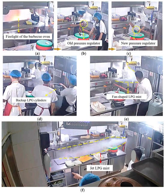 LPG leakage process caused by human operation error: (a) turning on the barbecue oven; (b) removing the old pressure regulator; (c) installing the new pressure regulator; (d) first small-scale LPG leakage; (e) second LPG leakage; (f) large-scale LPG leakage.