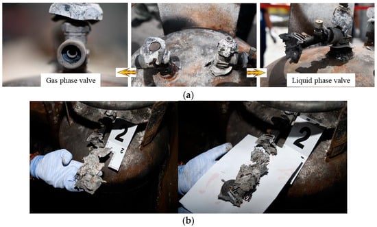 The double-valve LPG cylinder and the traces after explosion: (a) the damaged cylinder double valve; (b) the completely destroyed pressure regulator.