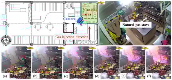 From Figure 9a–c, it is evident that when the LPG was ignited by the stove, the initial combustion flame appeared light blue, indicating a low gas concentration. Due to the heavier nature of LPG compared to air, the initial flame propagated downward first. As the flame spread, the middle and base of the flame transitioned to yellow and red, as shown in Figure 9d–f, signifying insufficient oxygen for the combustion reaction. Additionally, it indicated that the closer the proximity to the barbecue area, the higher the concentration of leaked gas. These six frames of monitoring images illustrate the development process of the initial flame, captured by a standard household camera with a low frame rate, highlighting the slow progression of the flame in the initial stages of the explosion. Influenced by numerous obstacles, the flame rapidly extended along the channel towards the barbecue area, triggering a more intense explosion effect, ultimately leading to this severe accident disaster.