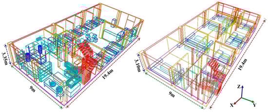 The physical model dimensions and the three-dimensional positioning of internal building components are shown in Figure 11. The overall size of the two-story building model was 19.4 m (X) × 9 m (Y) × 6.45 m (Z). The dimensions of the 1st floor and the 2nd floor were 19.4 m (X) × 9 m (Y) × 3.35 m (Z) and 19.4 m (X) × 9 m (Y) × 3.10 m (Z), respectively. For the numerical calculations, the ignition was placed near the gas stove in the northeast corner of the kitchen cooking area, with a height of approximately 0.8 m from the ground. The initial pressure in the model corresponds to the local atmospheric pressure of 9.93 × 104 Pa at the time of the incident, while the initial ambient temperature was set to 305 K. The surface roughness was 0.01, the atmospheric stability was categorized as F, and the average altitude was 1100 m. To capture critical data, multiple measuring points were positioned at key damage locations and areas where personnel were affected to gather parameters such as explosion overpressure, temperature, and oxygen content.