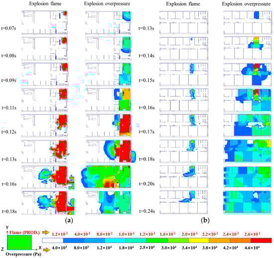 The evolution of the explosion flame (left) and explosion overpressure (right) with time: (a) the explosion propagation path of the first floor; (b) the explosion propagation path of the second floor.