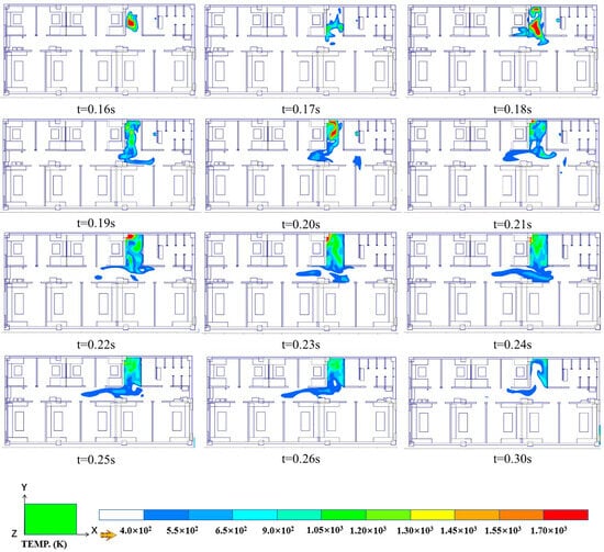 In Figure 12b, the development of explosion overpressure in the second-floor corridor was primarily concentrated in the stairway area, with the maximum overpressure occurring near the wall directly facing the stairway. The overpressure levels in the machine room and toilet exceeded 20 kPa. In Room 111, the overpressure was mainly localized in the southeast corner, where wall cracks were present. Comparatively, the toilet experienced a higher accumulation of overpressure than the corridor. To investigate the progression of the explosion flame on the second floor, Figure 13 presents a cloud map of the explosion temperature observed on the horizontal section over time. The white areas in the cloud map indicate regions on the second floor that were not significantly impacted by the explosion flame. The flame development was most pronounced in the stair area, where the explosion temperature reached its peak. The maximum explosion temperature in the corridor was near the wall opposite the stairway, aligning with the maximum overpressure distribution. The flames extended along the east and west sides of the corridor, creating a high-temperature zone of approximately 10 m with temperatures exceeding 400 K in the east–west direction. At t = 0.18 s, the fire from the stairwell breached the wall crack and entered Room 111, leading to a rise in internal temperature.