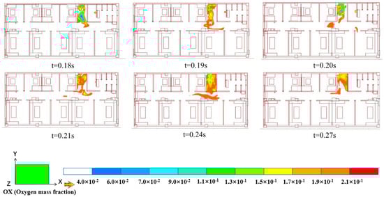 The analysis of the air oxygen content on the horizontal observation surface of the second floor over time provides insights into the correlation between the cause of death of individuals and the risk of explosion asphyxia, as shown in Figure 14. Following the explosion, the oxygen levels in the stairwell of the second floor experienced a significant decrease, with the minimum oxygen content dropping below 3.6% (volume fraction). Prolonged exposure to such a hypoxic environment could lead to shock, unconsciousness, heart failure, and ultimately death. In the corridor area near the staircase, the oxygen content was recorded at a minimum of 14.4% (volume fraction), with an anoxic range extending approximately 6 m in the east–west direction. Individuals within this range may remain conscious but experience reduced judgment capabilities. The oxygen content in the vicinity of Room 111 decreased to 16.2% (volume fraction), significantly impacting human muscle coordination and causing slow movement. As the accident progressed, the high-temperature toxic smoke and dust from the kitchen on the first floor were expected to rapidly spread to the second floor, leading to a substantial reduction in oxygen concentration. This severe asphyxiation scenario was likely to result in the death of most individuals on the second floor.
