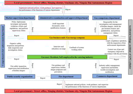 As the first control level, the local government was responsible for implementing the national energy policy, guiding the work, and supervising the gas management department to strictly perform its functions. The second control level consisted of seven departments, including the market supervision department, approval department, and law enforcement department. This level was responsible for conducting hidden danger investigations, providing education and training, overseeing rectification and investigations for gas companies and gas users, and playing a crucial role in regulating gas production and use safety. The third level, represented by the gas company, offered gas sources, operational training, and daily maintenance services for gas users. Gas users, at the fourth level, were required to promptly report any abnormal gas cylinder work conditions to the gas company and use the gas cylinder correctly. All lower levels were obligated to report to the higher level.