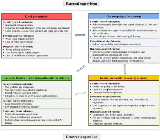 In the exploration of the causes of liquefied petroleum gas leakage and explosion accidents, the systems theoretic accident model and processes (STAMP) framework was employed to establish four fundamental level control structures. By utilizing the STAMP, the risk control structure, safety constraints, external supervision, and grassroots operations of the accident system were comprehensively analyzed. The STAMP is a model that identifies the causes of accidents in complex systems by ensuring that control objectives align with safety constraints []. The STAMP diverges from the linear thought process of traditional safety analysis methods and is particularly suited for analyzing safety in complex and nonlinear systems. As a result, it finds widespread application in accident investigations, construction projects, and transportation systems, offering a robust framework for understanding and addressing the root causes of accidents in intricate systems [,].
