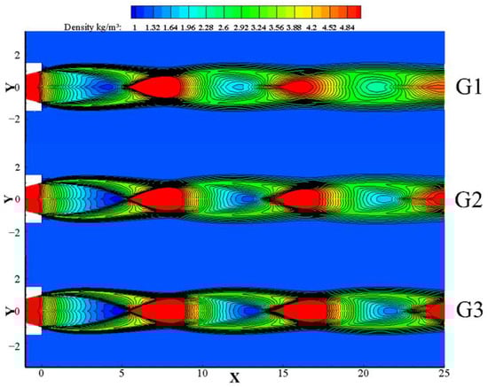 The gas density clouds simulation results of the supersonic free jet at three grid scales are shown in Figure 2. The position coordinates in the figure are dimensionless, divided by the nozzle outlet radius. It was found that as the number of grids increased, the shock system structure of the supersonic free jet became clearer. In the gas density cloud of the mesh model G1, the oblique shock structure at the third node of the jet was almost indistinguishable. In the gas density cloud of the mesh model G3, the oblique shock at the third node was relatively clear. Compared with the schlieren of the free jet tested by Tsuboi et al. [], it can be found that the length of the jet section in the simulation results was basically consistent with the experimental results, which verified the reliability of the simulation calculation.