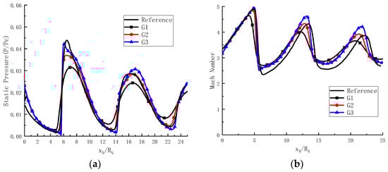 Figure 3 shows the distribution of gas static pressure and gas Mach number along the central axis. It was found that the capture of the shock wave position and the calculation of the shock pressure were basically consistent with the literature simulation results []. Under the grid model G1 scale, the calculation results were different from the literature results. The dissipation effect of the grid was obvious, resulting in a small gas pressure after the shock wave. Under the grid model G2 scale, the calculation results were significantly improved. Except for the fact that the pressure after the first oblique shock was slightly less than the calculated value in the literature, the rest were consistent with the calculation results in the literature. Under the grid model G3 scale, the structure of supersonic free jet shock wave was more accurately captured and the gas pressure was higher after each oblique shock.