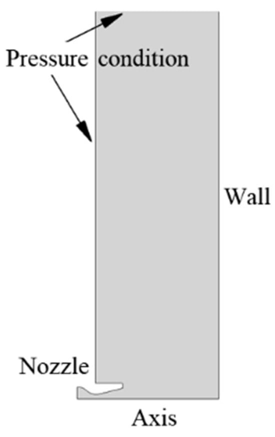 The schematic of the physical model is shown in Figure 4, and the dimension of the nozzle was consistent with the previous text. The wall surface perpendicular to the jet direction was set downstream of the nozzle and three different distances were set from the wall to the nozzle exit, which were 8.74 RN, 12.2 RN, and 15.7 RN. Figure 5 shows the meshing of the model; the mesh was encrypted at the wall position to improve the solution accuracy near the wall.
