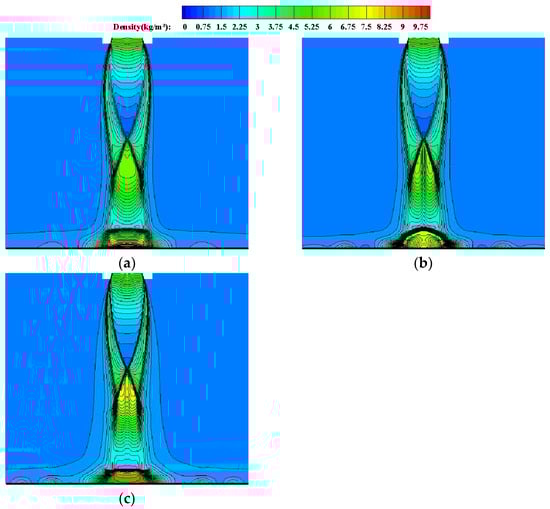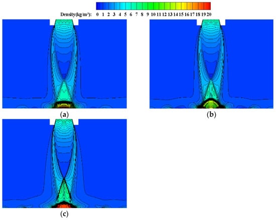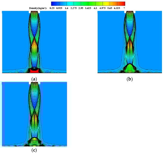 Figure 6, Figure 7 and Figure 8 show the simulation diagrams of gas density clouds under different working conditions. Comparied with the schlieren diagrams of the corresponding experimental working conditions [], the structure of the jet shock system under each simulated working condition basically corresponded to the structure in the experimental schlieren diagram. There was an obvious free jet area, wall stagnation zone, and wall jet area. At the same time, the wall had little effect on the upstream structure of the gas shock jet, that is, the free jet area. The three different turbulence models had the same nodal structures as the free jets except for the position near the wall. In the wall jet area, all three of the turbulence models could simulate the continuous shock waves and expansion wave reflection structures. Compared to the S-A model and SST k-ω, the simulation results of the realizable k-ε model were worse in terms of the clarity of the predicted cloud map of this structure. As the compression–expansion system weakened, the wall jet gradually became uniform.