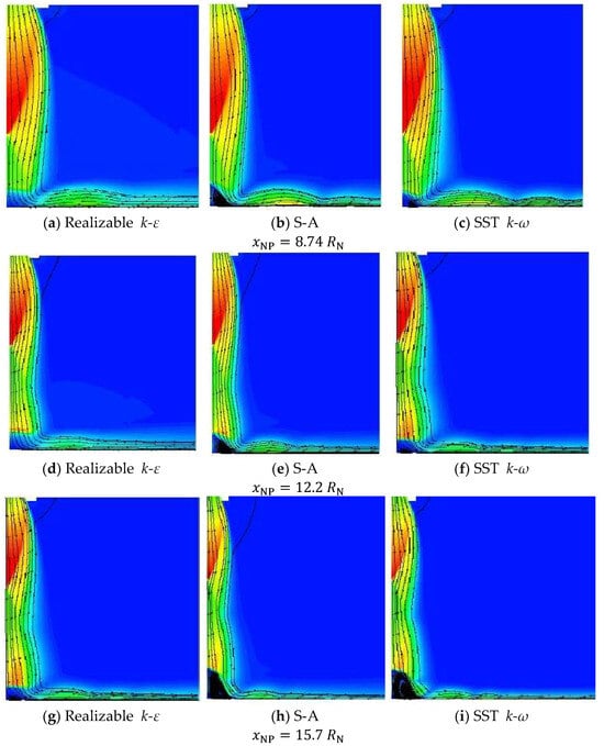 Figure 9 shows the Mach number and gas streamline diagrams of the impinging jet field under different turbulence model computational conditions. Under all calculation conditions, the Mach number distribution of the impinging jet field was basically the same. In some working conditions, there were obvious large-size gas reflux structures in the wall stagnation zone, which were usually referred to as stagnation bubbles. However, for the realizable k-ε model, the impinging jet field at the three wall distances did not produce reflux structures, i.e., there was no stagnation and antifoaming. For the other two models, all calculation conditions showed stagnation bubbles. When the spacings were 8.74 RN and 12.2 RN, the area of the reflux zone predicted by the S-A turbulent model was significantly larger than that of the SST k-ω model, which calculated a weaker airflow reflux. When the spacing was 15.7 RN, both of the turbulence models predicted the stagnation bubbles in the impinging jet field, and the sizes of the wall reflux zone were similar.