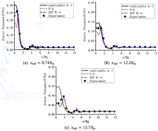 It is well known that supersonic impact jets form boundary layers at bulkheads, accompanied by large pressure gradients and flow separation []. Simulation prediction of impact jets serves as one of the important tools to verify the performance of the bulkhead. Common turbulence models have good prediction of heat transfer coefficients in shock jets, such as the realizable k-ε model, the Spalart–Almaras (S-A) model, and the shear stress transfer (SST) k-ω model []. Here, with the help of Fluent, the above three models were utilized to compare and analyze the wall pressure distribution and flow field characteristics of the impinging jet, in order to select a more suitable turbulence model. The experimental model and working conditions from the literature were used and compared with the experimental results [].