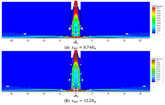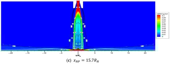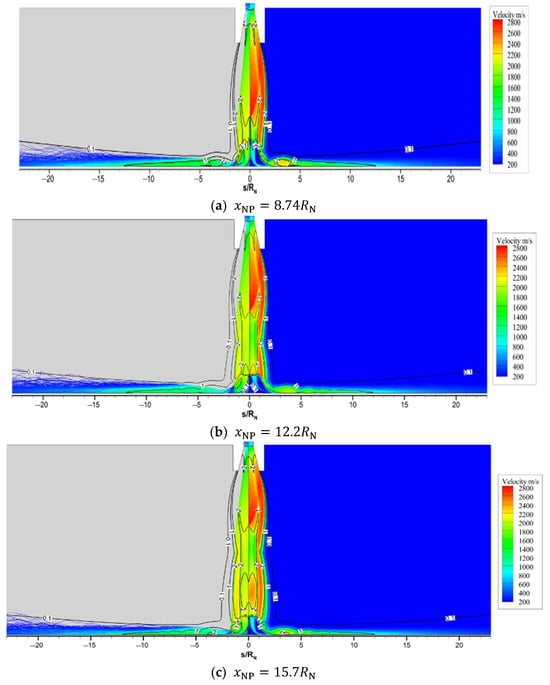 Figure 13 shows the velocity distribution of the particle phase and the gas phase after the accidental ignition of the motor at three different jet impact distances. The left side of the figure is the particle motion trajectory and velocity distribution, while the right side is the gas phase velocity distribution. Contour lines are the gas Mach numbers. The particle injection caused significant changes in the flow structure of the supersonic impact jet field. As can be seen from the velocity comparison of the motions in the figure, the velocity of the gas phase component was higher than that of the particle phase component, and the hysteresis effect of the particle movement relative to the gas flow was obvious. This is caused by the characteristics of the particles themselves. After passing through the nozzle, the gas phase expanded and accelerated due to its compressibility, and soon reached supersonic speed. The particle phase was incompressible and could only rely on the aerodynamic force of the continuous phase to move. However, the particle phase more easily maintained the original motion state under the action of inertia, and the speed change lagged. At the same time, the hysteresis of the particle phase could also affect the flow of the gas phase, resulting in a change in the gas-phase flow structure, i.e., a change in the shock wave structure.