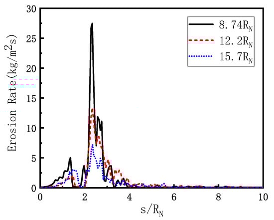 Distribution of the erosion rate of solid particles relative to the wall in the two-phase jet at different impact distances.