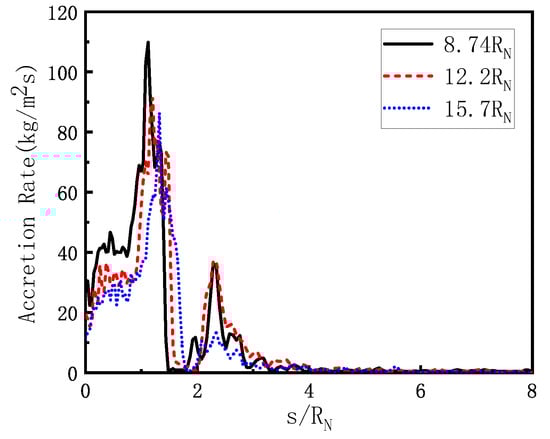 Figure 15 shows the calculated erosion rate of solid particles relative to the wall in the two-phase jet at different impact distances, while Figure 16 shows the deposition rate of solid particles at the wall.