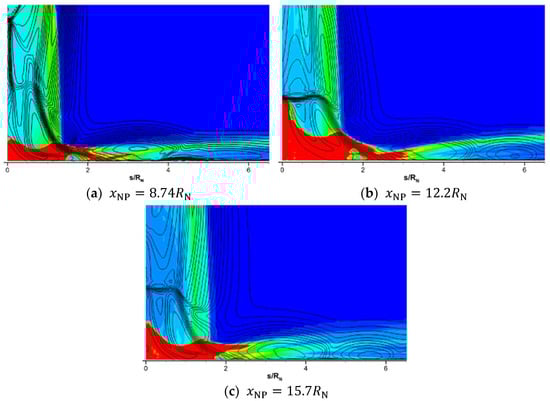 In the wall stagnation zone of the impact jet, the addition of solid particle phases had the greatest effect on the flow field. Compared with the pure gas-phase flow field, the distances between the shock wave and the wall surface of the two-phase jet field were significantly increased in the 8.74 RN and 12.2 RN working conditions. In the 15.7 RN working condition, the flow structure of the retardation zone was consistent with the previous two working conditions and quite different from the pure gas phase. This was because the particle phase rebounded many times at the near wall after hitting the wall. On the one hand, a higher degree of particle aggregation was formed in the near wall area, and the particle phase distribution density was higher. On the other hand, the rebound of particles had a stronger hindrance to the flow of the jet gas phase, making the wall front shock move forward, as shown in Figure 14. In the 15.7 RN working condition, the original stagnant flow defoaming structure disappeared, which was attributed to the particle phase changing the structure of the jet impingement system.