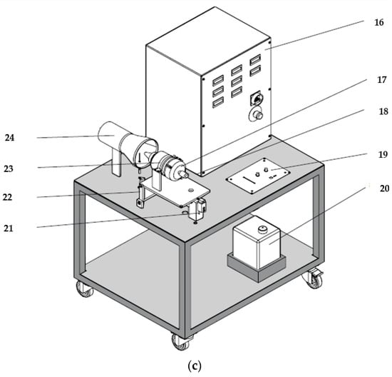 The following additional components are included: (16) the switch cupboard with indicators; (17) the inlet nozzle for air flow measurement; (18) the turbine desk; (19) the gas turbine control panel; (20) the fuel tank; (21) the force sensor for thrust measurement; (22) the bearing of the turbine desk; (23) the jet turbine; and (24) the mixing tube.