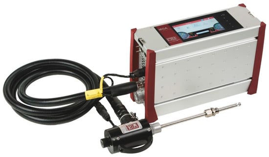 Gaseous emission measurements were conducted using the MRU Vario Plus analyzer (Messgeräte für Rauchgase und Umweltschutz GmbH, Neckarsulm-Obereisesheim, Germany), as shown in Figure 2. Simultaneously, the analyzer measured various gas components, including those of interest, namely CO and SO2. The measuring range for sulfur dioxide (SO2) was 0–2000 ppm with an accuracy of ± 10 ppm or 5%; for carbon monoxide (CO), the measuring range was 0–4000 ppm with an accuracy of ± 10 ppm or 5%.