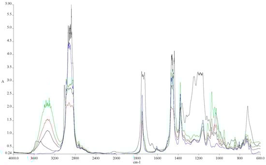 Density was measured for all samples at a temperature of 22 °C following SR EN ISO 3675/2002 standards [], using a graduated cylinder and a thermal densimeter manufactured by Termodensirom SA, Bucharest, Romania. Flash point was determined for all samples according to ASTM D92 standards [], using a Cleveland flash point tester provided by Scavini, Italy. Kinematic viscosity was measured for all samples at 40 °C in accordance with SR EN ISO 3104/2002 standards [], using a viscometer supplied by Scavini, Italy. The lower calorific value was determined for all samples following ASTM D240-17 standards []. An IKA WERKE C 2000 calorimeter sourced from Cole-Parmer, St. Neots, UK, was used, as well as a C 5012 calorimeter bomb manufactured by IKA Analisentechnik GmbH, Staufen, Germany. Fourier transform infrared spectroscopy (FTIR) analysis was conducted using a Spectrum Oil Express Series 100 spectrometer, version 3.0, provided by Perkin Elmer, Romanian representative located in Tâncăbești, Romania, along with its dedicated software (Spectrum OilExpress v3.0.0 provided by Perkin Elmer along with the spectometer).