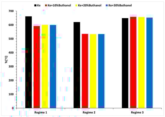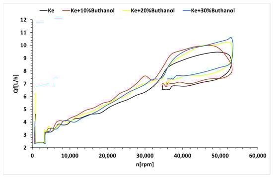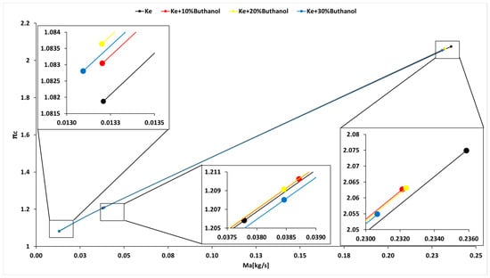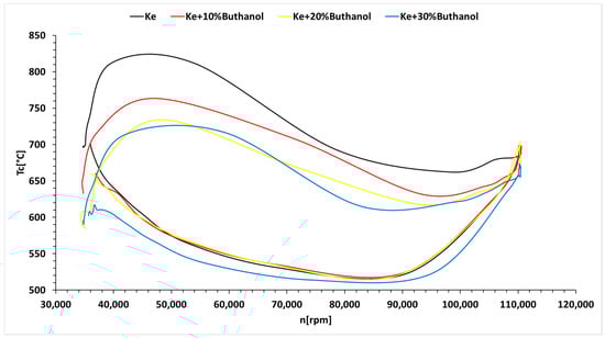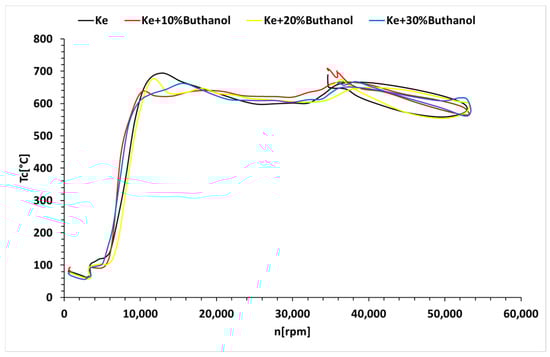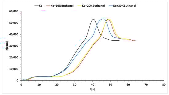 Figure 4 demonstrates a correlation between the starting time and the concentration of n-butanol, with Ke showing the shortest starting time. Figure 5 indicates a minor decrease in fuel temperature during the starting process, which is attributed to the influx of outside air into the combustion chamber by the electric starter. Moreover, the ignition timeframe, as depicted in Figure 5, extends with higher n-butanol concentrations. Additionally, Figure 5 shows that as the alcohol concentration increases, the temperature ahead of the turbine decreases during the starting process, resulting in a delay. Figure 6 highlights a reduction in the fuel flow rate required for the starting process with increasing n-butanol concentration. This is attributed to Ke’s higher starting temperature, which necessitates a larger initial fuel quantity. However, after reaching the operating temperature, the variation in fuel flow rate reverses, indicating higher rates for fuel blends and lower rates for Ke. This dynamic interaction is essential for comprehending the behavior of fuel blends during both the initial “cold” phase and the subsequent operational periods of the starting procedure.