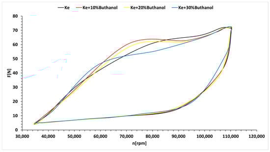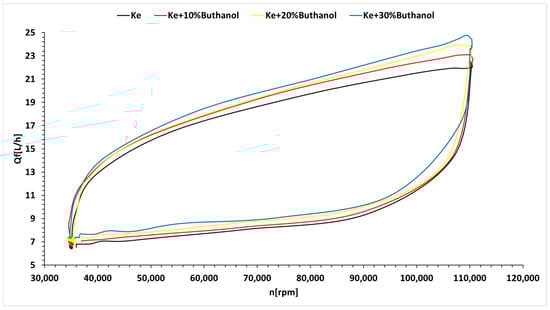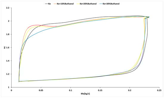 Analyzing Figure 13, it can be observed that the working line shifts when using butanol blends compared to the base fuel—kerosene. This shift is not significant and does not endanger the operation of the micro-turbo engine. Examining Figure 14, it is evident that the working line during rapid acceleration and deceleration deviates considerably from the working line established based on the quasi-stationary regimes for all tested fuels, but without causing a surge.