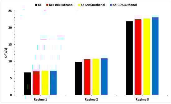 As observed in Figure 15, the CO concentration increases with a higher alcohol concentration. This is because alcohol introduces more oxygen into the blend, actively participating in the combustion reaction. Additionally, as the concentration increases, the amount of air needed for the stoichiometric reaction decreases, leading to a less efficient combustion and increased CO formation. The temperature strongly influences CO formation, with lower fuel temperatures resulting in higher CO production, rather than CO2 production. As expected, the CO concentration rises across the regimes as fuel flow increases.