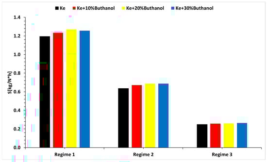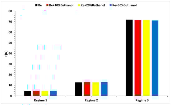Figure 12 illustrates the variations in thrust (F) according to the operating regime and tested fuel blend. In regimes 1 and 2, thrust variations are negligible, but a decrease is observed in regime 3. Additionally, thrust decreases with increasing alcohol concentration. Overall, the analysis of these figures leads to the conclusion that the functionality and integrity of the engine remains intact and unaffected throughout the test, highlighting the engine’s robustness under various operating conditions and fuel blends.