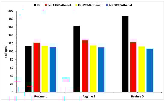 For the analysis of the environmental impact of butanol, the concentration of CO and SO2 was recorded in Figure 15 and Figure 16, which illustrate the variations in CO and SO2 levels across all blends and under all three regimes.