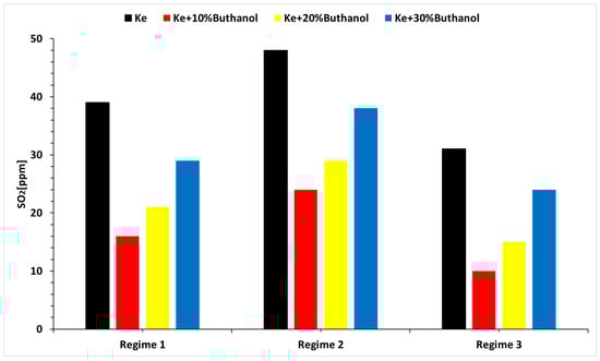 Regarding SO2 formation, its variation is independent of alcohol concentration. In fact, compared to pure Ke, adding alcohol increases the SO2 concentration due to the additional oxygen introduced by the alcohol. In terms of regimes, it appears that for pure Ke, the maximum regime is most efficient in terms of SO2 production because of the higher burning temperatures. However, for blends with added alcohol, the idle regime seems most efficient, likely due to the oxygen introduced by the alcohol.