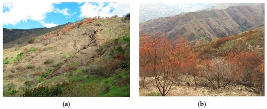 (a) Visible effects of the wildfire on the vegetation at the El Saco basin (b) Burned shrub layer one month after the event in 2019, Quilanga/Ecuador.