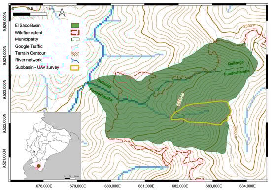 The investigated El Saco basin lies in the temperate zone (Cfb, Köppen-Geiger Classification) of the southern Andes in Ecuador (canton Quilanga/Loja). Its landscape is characterized by grass- and shrubland, as well as some forest patches (Figure 2). The presence of non-native tree species (eucalyptus and pine) influences the water balance of the area, as they tend to dry the soil, which favors the spread of wildfires. Coffee production, farming, and pastureland are the main components of the cultivated landscape. Annual precipitation is about 1100 mm whereby the wildfire risk increases from June to November. The months from December to May are characterized by short and heavy rainfall events []. Between 2012 and 2023, four major wildfires have been reported in the surroundings of Quilanga: in 2012 (Parroquia Fundochamba, sector Collingora, Quilanga); in 2016 (Parroquia Fundochamba, sector Guaguasaco, Quilanga); the investigated event in 2019 (Figure 2 and Figure 3) []; and the last wildfire in 2023 (Parroquia El Ingenio, sector San Antonio de las Aradas). The preparation of farmland using fire is a common tool in the area in question, causing major problems when not controlled sufficiently in the months with low precipitation. The investigated fire event appeared in September 2019, lasted for two weeks, and affected more than 8000 ha.