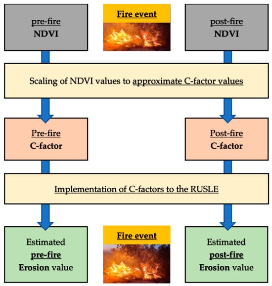 Workflow of the C-factor development for pre- and post-fire conditions, as well as implementation in the RUSLE.