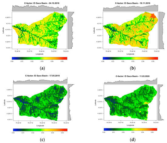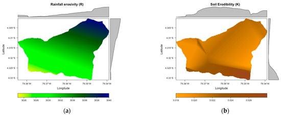 The R-factor (in MJ·mm·ha−1·h−1·yr−1) was calculated from the average monthly cumulated rainfall. For its elaboration at the study site, existing data from the Catamayo watershed [], which is located near the El Saco basin, was interpolated using the Inverse Distance Weighting (IDW) method [] (Figure 5a).