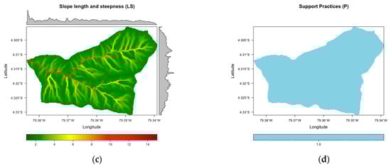 RUSLE input parameters at the El Saco basin: (a) rainfall erosivity R, (b) soil erodibility K, (c) slope length and steepness LS, and (d) support practices P.