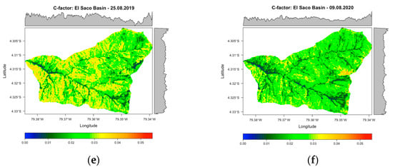 NDVI-derived C-factors at different dates in pre- and post-fire conditions at the El Saco basin: S2 Pair 1: (a) 24 October 2018 and (b) 18 November 2019; S2 Pair 2: (c) 17 May 2019 and (d) 11 May 2020; S2 Pair 3: (e) 25 August 2019 and (f) 9 August 2020.