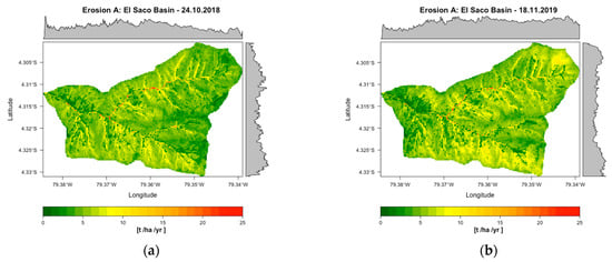 At the sub-basin of El Saco, where the UAV survey was carried out, an area of 2.45 ha (2.83% of the sub-basin) was predicted to be higher than 6 t ha−1 yr−1 in pre-fire conditions (Figure 9a). The maximum erosion value was predicted to be 15.27 t ha−1 yr−1. In post-fire conditions 1.78 ha (2.05% of the sub-basin) counted values above 6 t ha−1 yr−1, whereby the maximum value was predicted to be 15.76 t ha−1 yr−1 (Figure 9b). Generally, the erosion model predicted two intense erosion areas next to the outlet, as well as the lower area of the sub-basin. While the number of erosion values above 6 t ha−1 yr−1 decreased due to increased vegetation development in the first post-fire year [], the number of values indicating high erosion, increased. According to the model prediction, the fire event intensified; therefore, so did the erosion behavior in these two, highly erosive areas of the sub-basin. The number of values above 15 t ha−1 yr−1 increased by a factor of 4 in the first post-fire year.