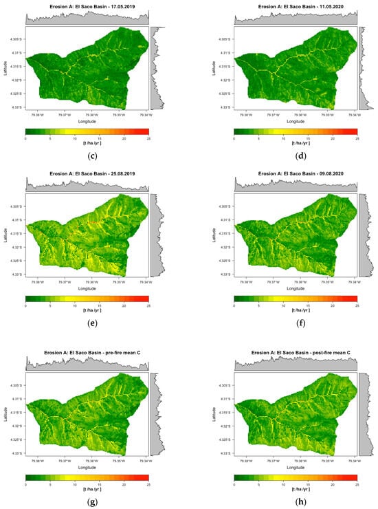 Estimated erosion using the RUSLE with C-factor values derived from different NDVI dates in pre- and post-fire conditions at the El Saco basin: S2 Pair 1: (a) 24 October 2018 and (b) 18 November 2019; S2 Pair 2: (c) 17 May 2019 and (d) 11 May 2020; S2 Pair 3: (e) 25 August 2019 and (f) 9 August 2020; Pair 4 S2-Time-Series: (g) pre-fire mean C and (h) post-fire mean C.
