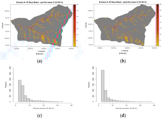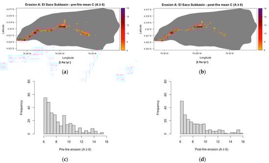Estimated erosion at the sub-basin above 6 t ha−1 yr−1: (a) pre-fire conditions and (b) post-fire conditions, as well as the associated frequency distribution (c,d).
